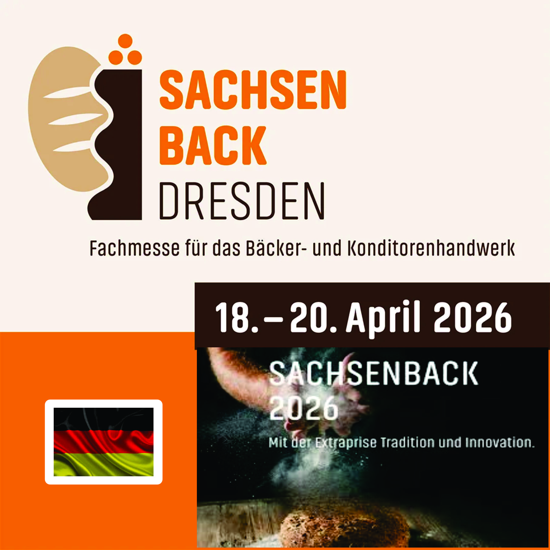 Del 18 al 20 de abril de 2026, SACHSENBACK se convertirá en el punto de encuentro central de la industria de la panadería y la confitería en el centro y este de Alemania. Los expositores presentarán sus últimos productos e innovaciones, mientras que los visitantes profesionales intercambiarán información sobre las tendencias actuales del sector. SACHSENBACK ofrece una plataforma única para aprender sobre tecnología laboral y operativa, materias primas, mercancías y promoción de ventas. Un programa de escenarios variado y emocionantes concursos convierten el evento en un verdadero punto culminante. Será una reunión de la industria con expertos porque los pabellones del recinto ferial de Dresde, así como el ambiente regional y familiar de la exposición, hacen de SACHSENBACK una feria potente con un encanto extraordinario para una región potente.
